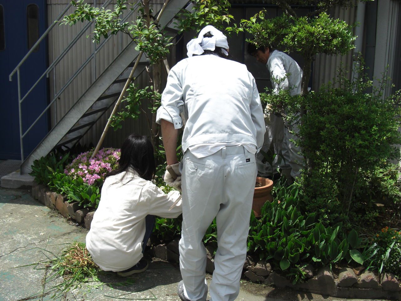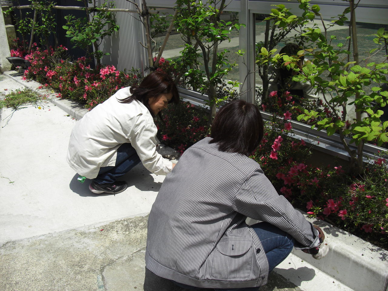 工場入り口の場所です。事務所のお姉さん方が手入れ中。