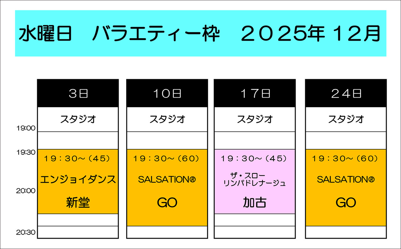2025年11月30日 【2025年12月】水曜日 夜のバラエティーのご案内 いつもオーファスポーツクラブ陽だまりの丘をご愛顧いただき誠にありがとうございます。2025年12月~ スタジオレッスンバラエティー枠の予定となります。皆様の御参加お待ちしております。 「スタジオレッスン」カテゴリの最新記事 < 前の記事次の記事 >