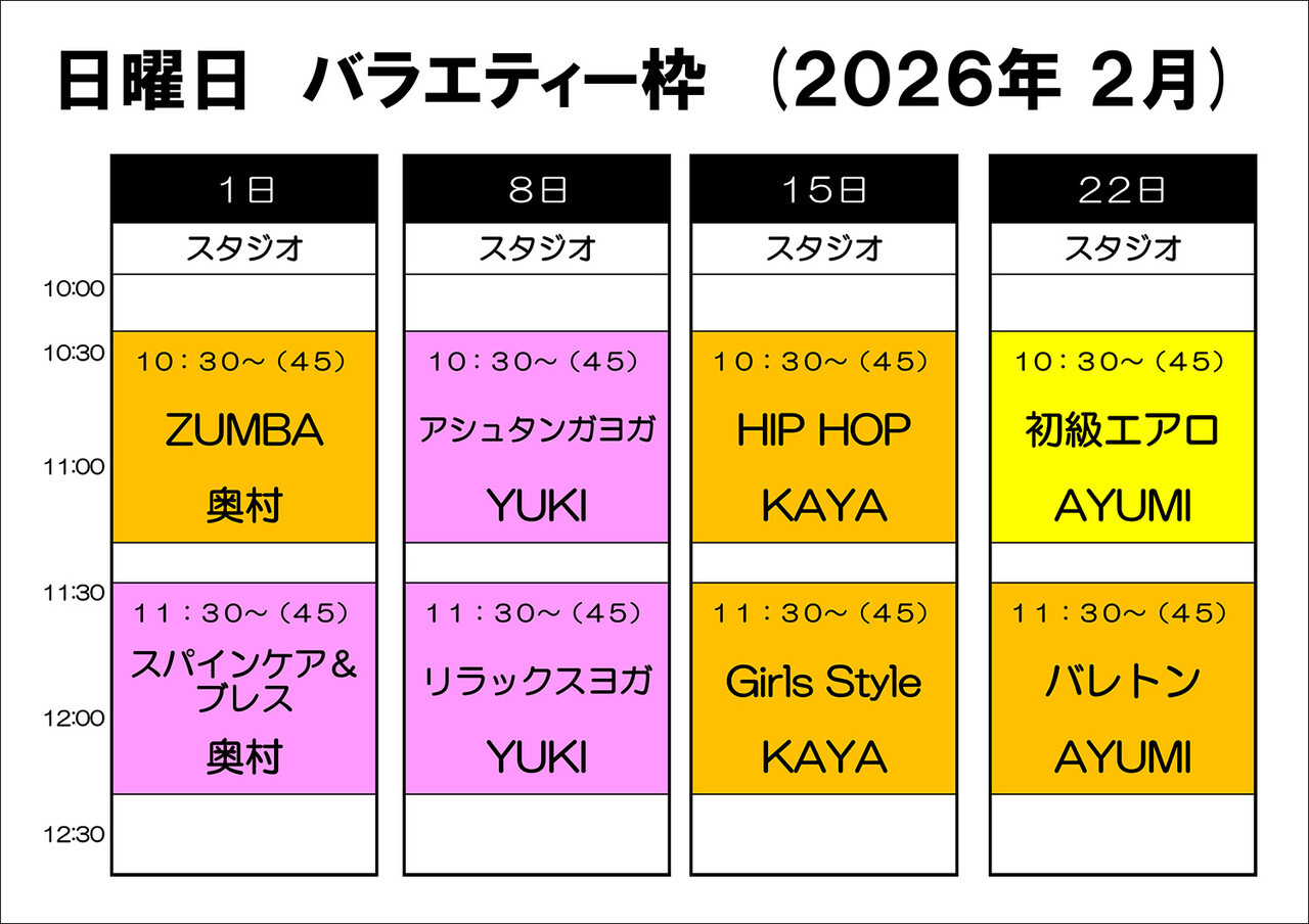 2026年01月04日 【2026年2月】日曜日バラエティーのお知らせ いつもオーファスポーツクラブ陽だまりの丘をご愛顧いただき誠にありがとうございます。2026年2月の日曜日のスタジオレッスンバラエティー枠の一覧です。皆様の御参加お待ちしております。 「スタジオレッスン」カテゴリの最新記事 < 前の記事次の記事 >