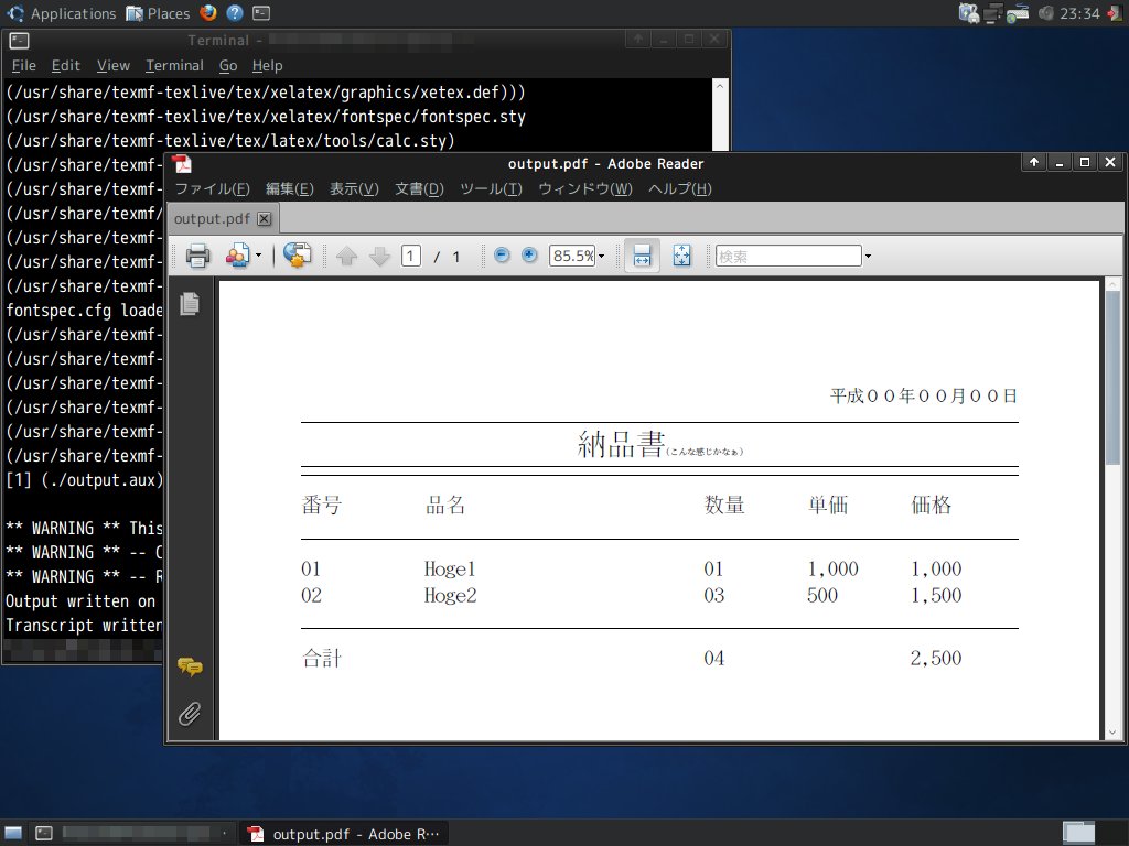 とりあえず、昨日に引き続き、帳票みたいなもんを簡単にPDF化するための準備。今日は簡単に、既に準備しておいたtest.texっていうXeLaTeX用のファイルを、PythonからXeLaTeXを起動してPDF化した後、PythonからAcrobat Readerを起動して確認するところのみをテスト。