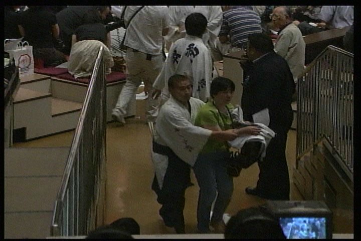 土俵真ん中でビラを撒こうとするも、高見盛に止められた模様。