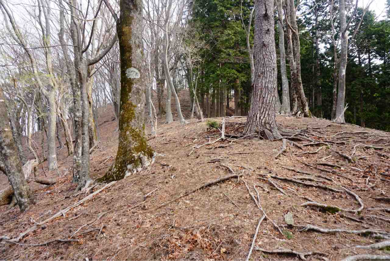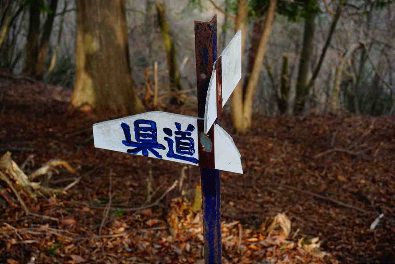 登山口から1時間強の急登を登りきれば北尾根分岐点です。昭文社の地図では分岐不明瞭とありますが、ここだけ指導標らしきものがありました。登りは県道方面から上がってきて、下りは県道方面へ降りていきます。