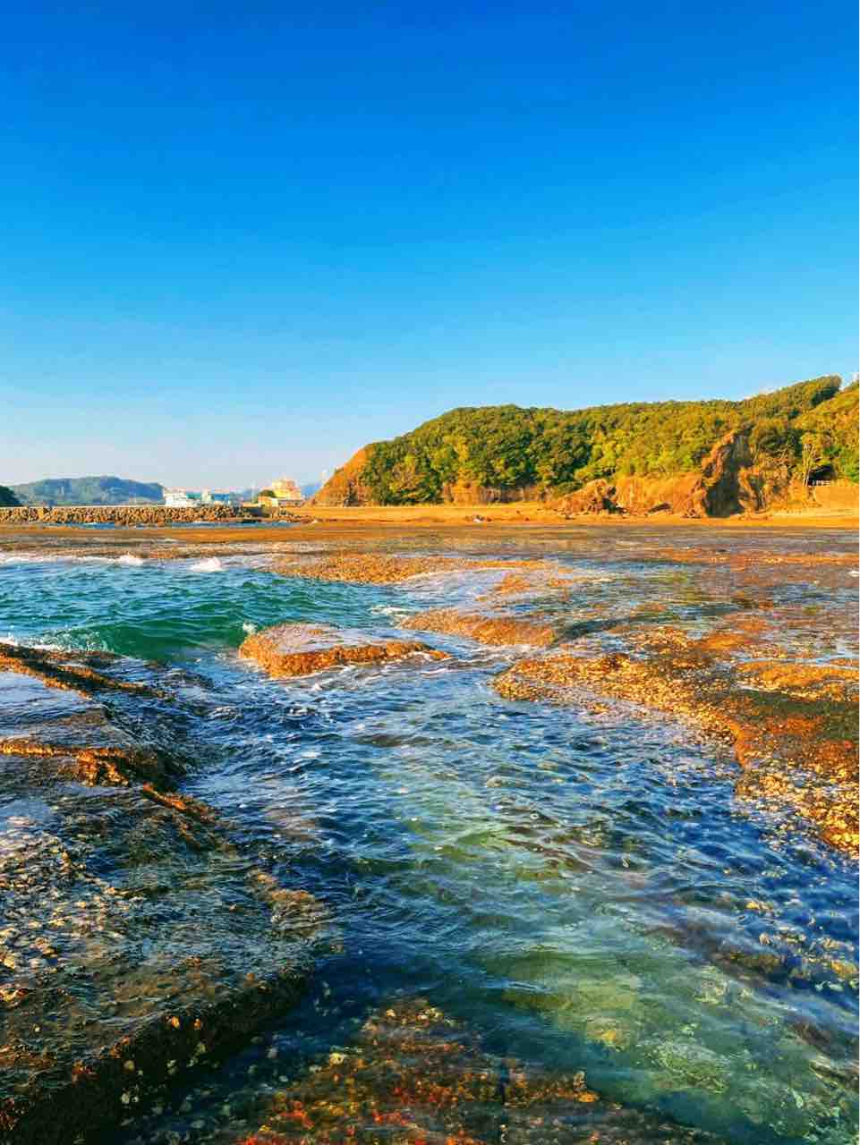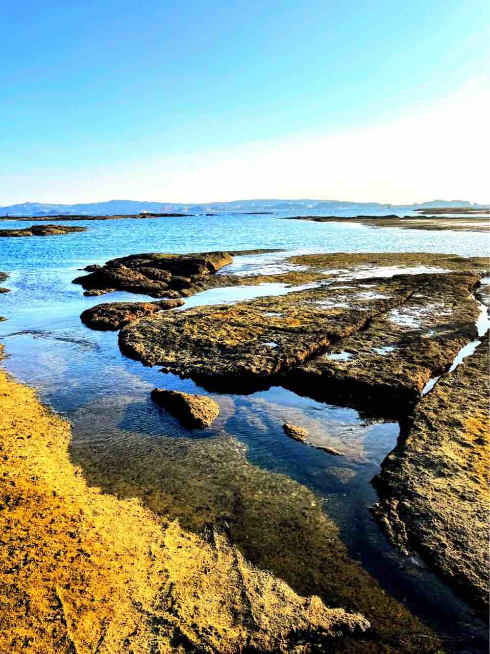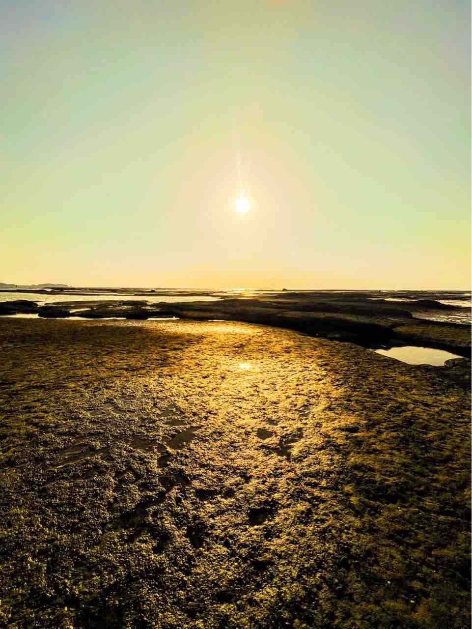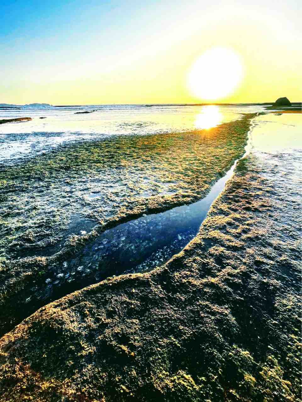 潮の満ち引きにより、平らな岩礁に溜まった海水が鏡の様になり