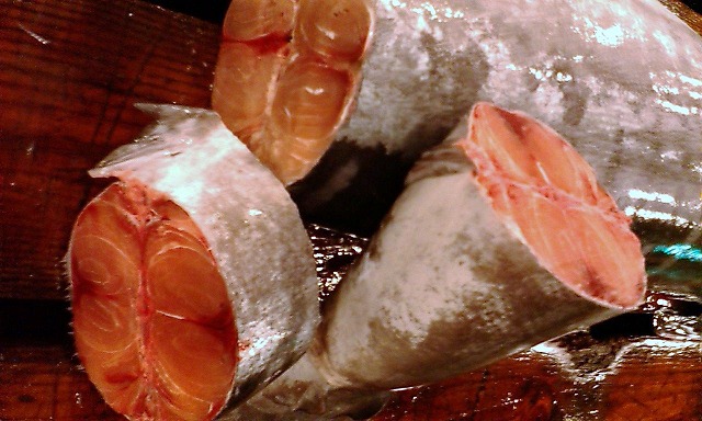 「ブリ」や「マグロ」など、冷凍の大物は、枕を並べたような状態で品定め。