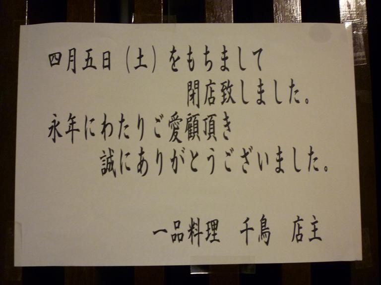 お昼に千鳥さんの前を通ったら閉店のお知らせがありましたので、