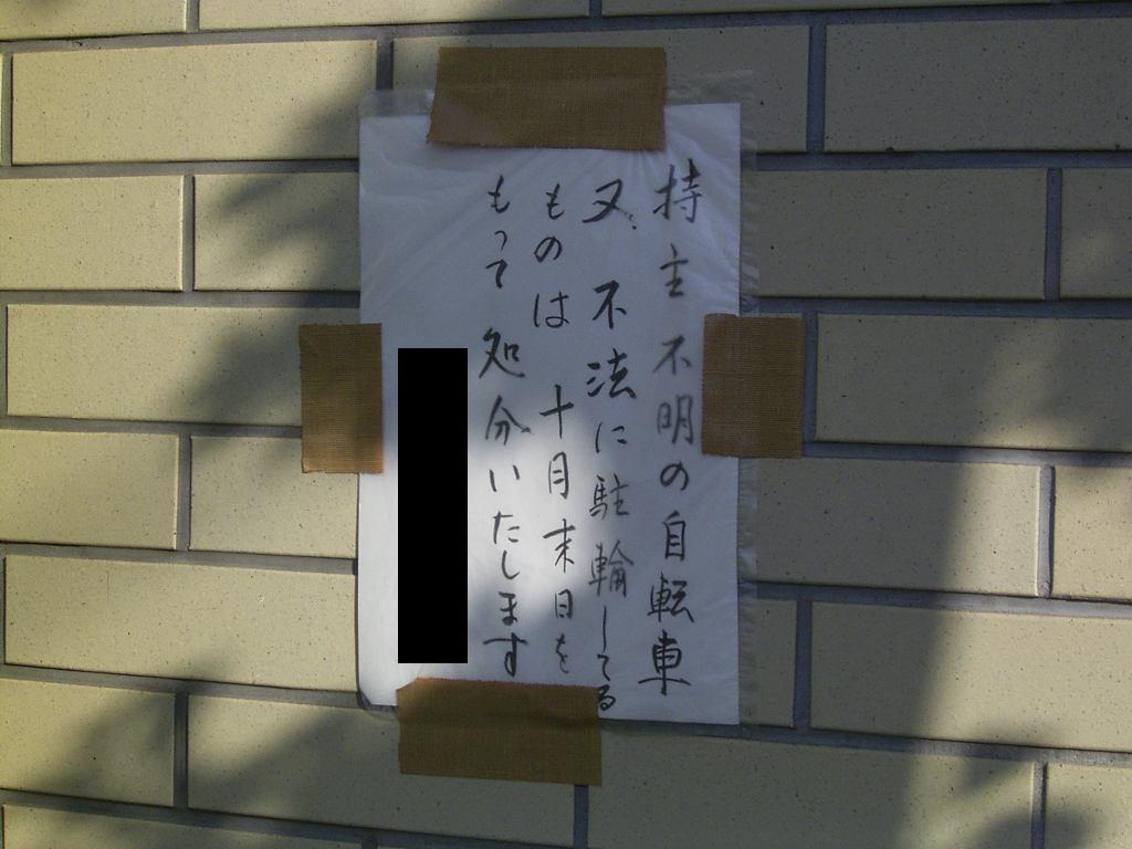 住人のものでない自転車を今月末で処分するという内容だけど、どうやって判断するんだろう。やはり全戸調査か?