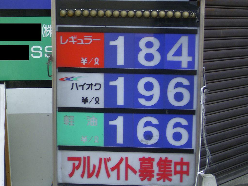 5月18日に載せた記事と同じスタンド。レギュラーガソリンが184円って高い。普通のスタンドなら177円前後のはずなのに。これは京都市中心部の立地で観光客目当てで高いのかと思いきや、どうもそうではないみたいで、周辺のスタンドは適正価格を表示している。なぜここだけこんなに高いのよ?