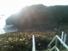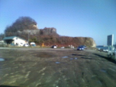 駐車場のすぐ東に、三段に岩肌の剥き出た奇妙な小山があって、頭を海に突き出している。