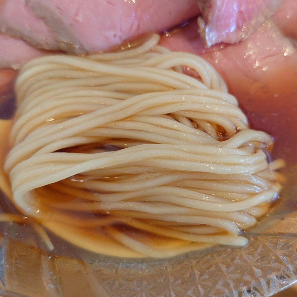 ツルツルっとした舌触りで、表面はシコシコとした食感と弾力を感じるものの、芯は確りとした歯応えを感じる低加水麺が、確りと水締めされています。