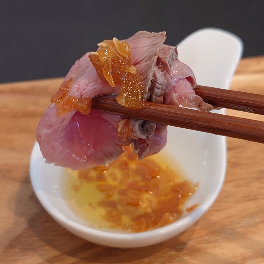 牛肉ならではの風味が実に良く、牛特有のクセはまるで無く食べやすい味わいで、弾力有る歯応えが心地良い。