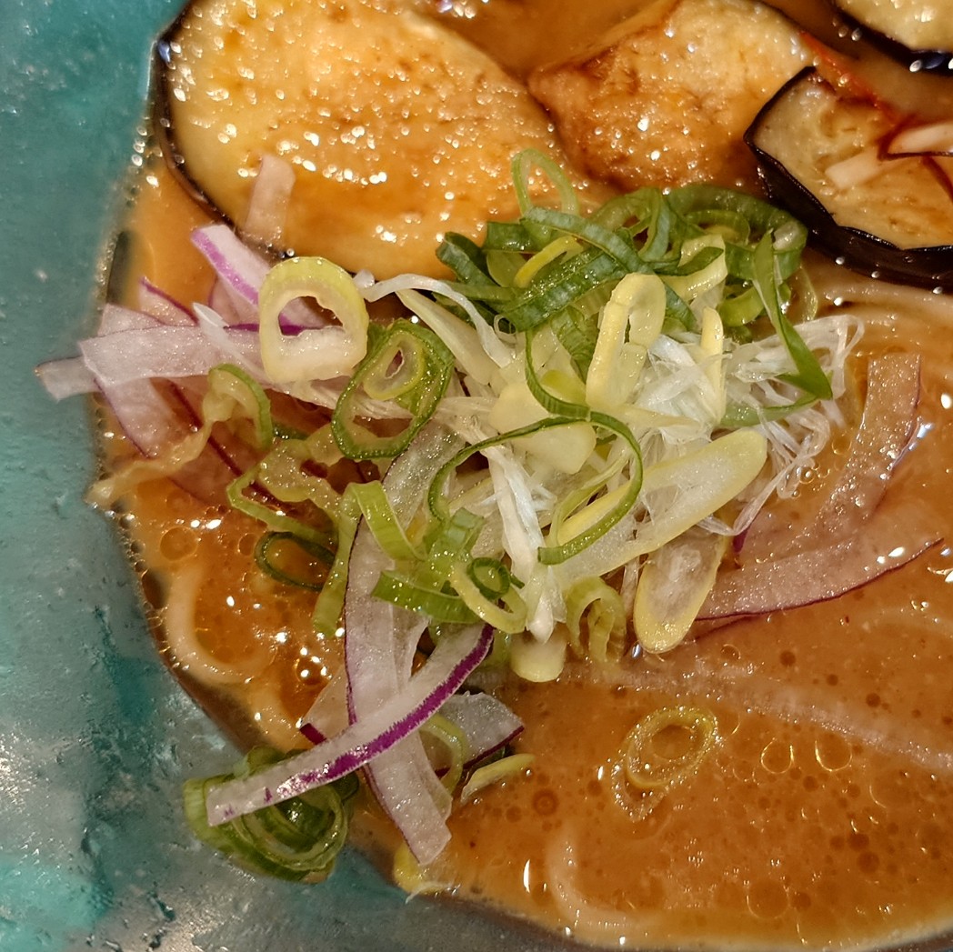 この“揚げ茄子”などは、らぁめんの提供ごとに一杯分づつ丁寧に揚げて、丼に盛り付けられていました。