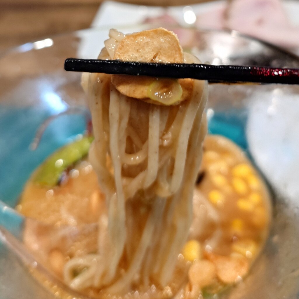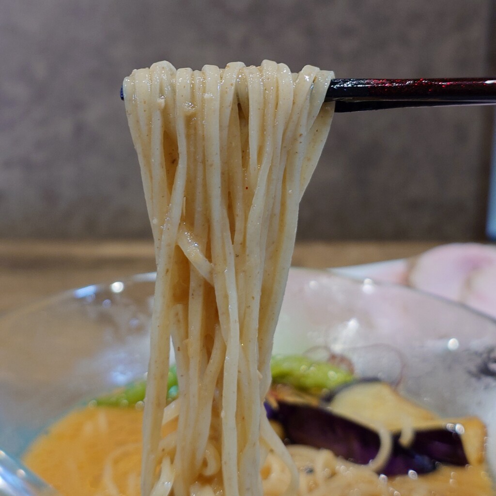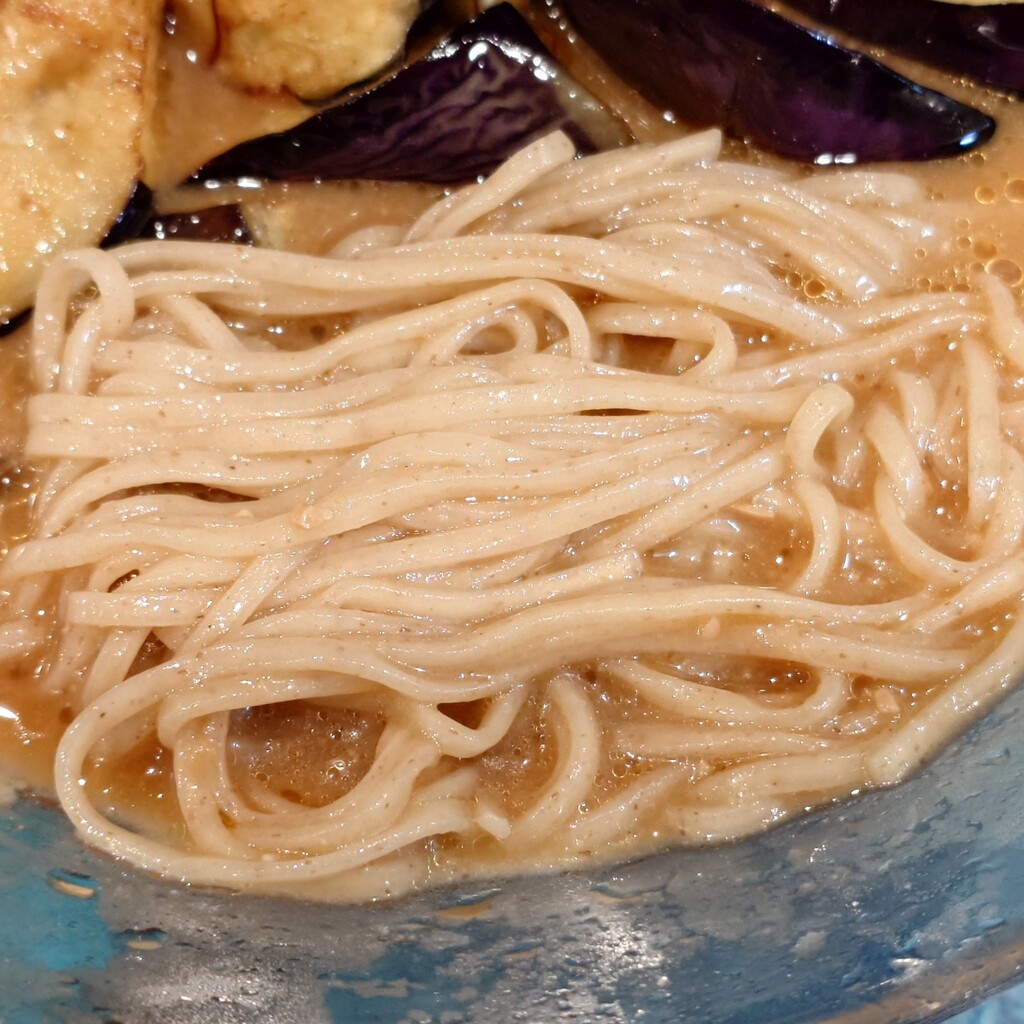 ややザラツキを感じる舌触りでシコシコとした強めの弾力有る食感の平打ち中細麺です。