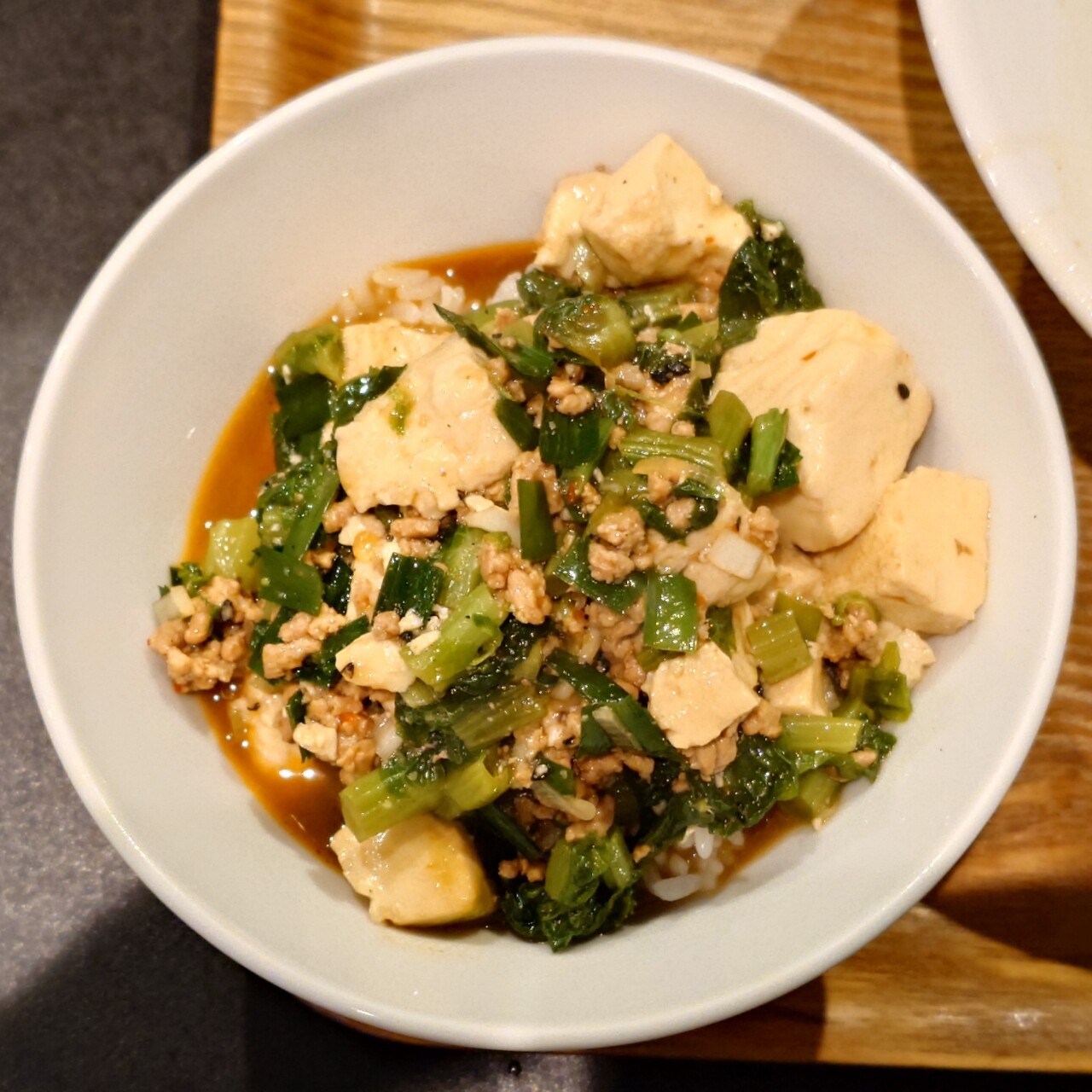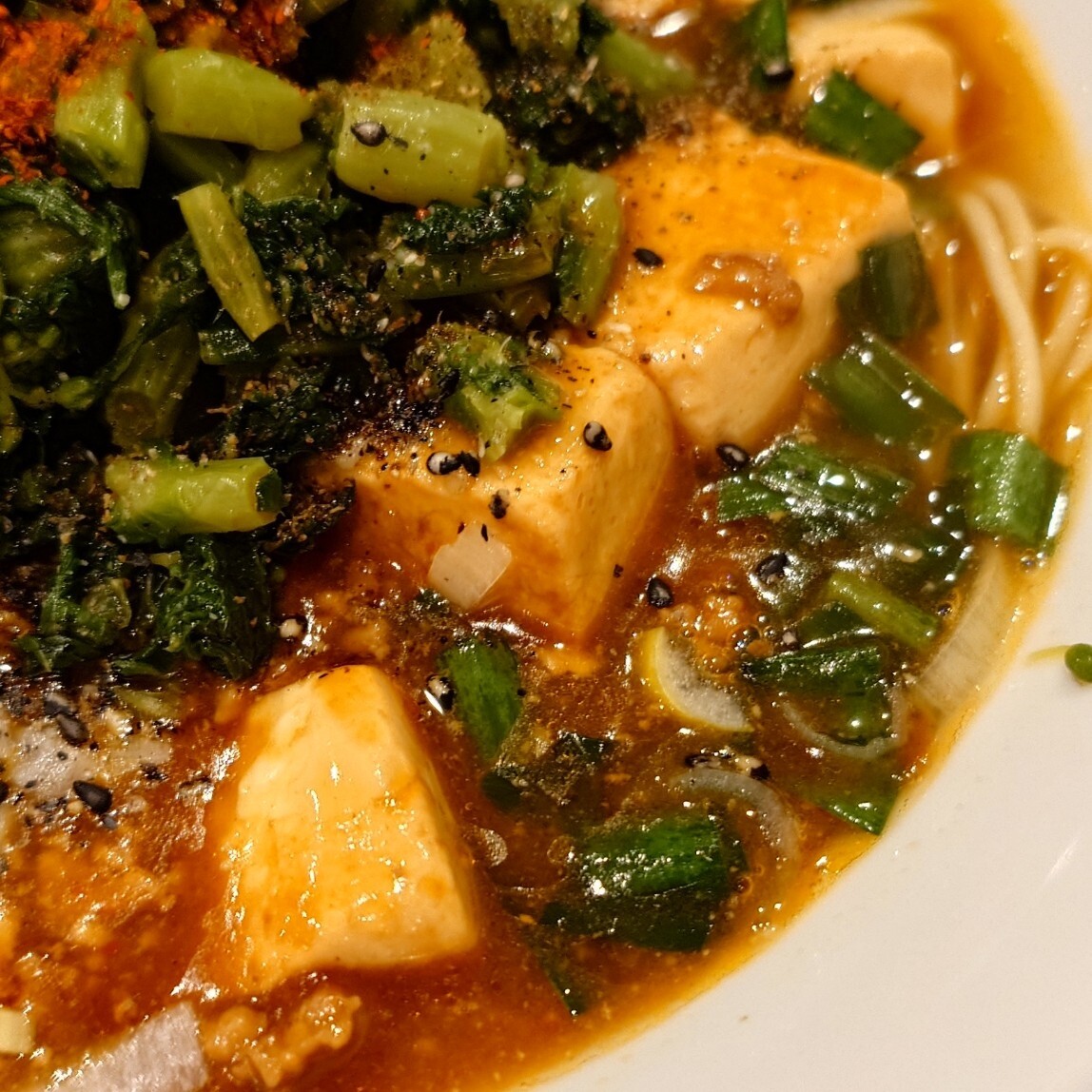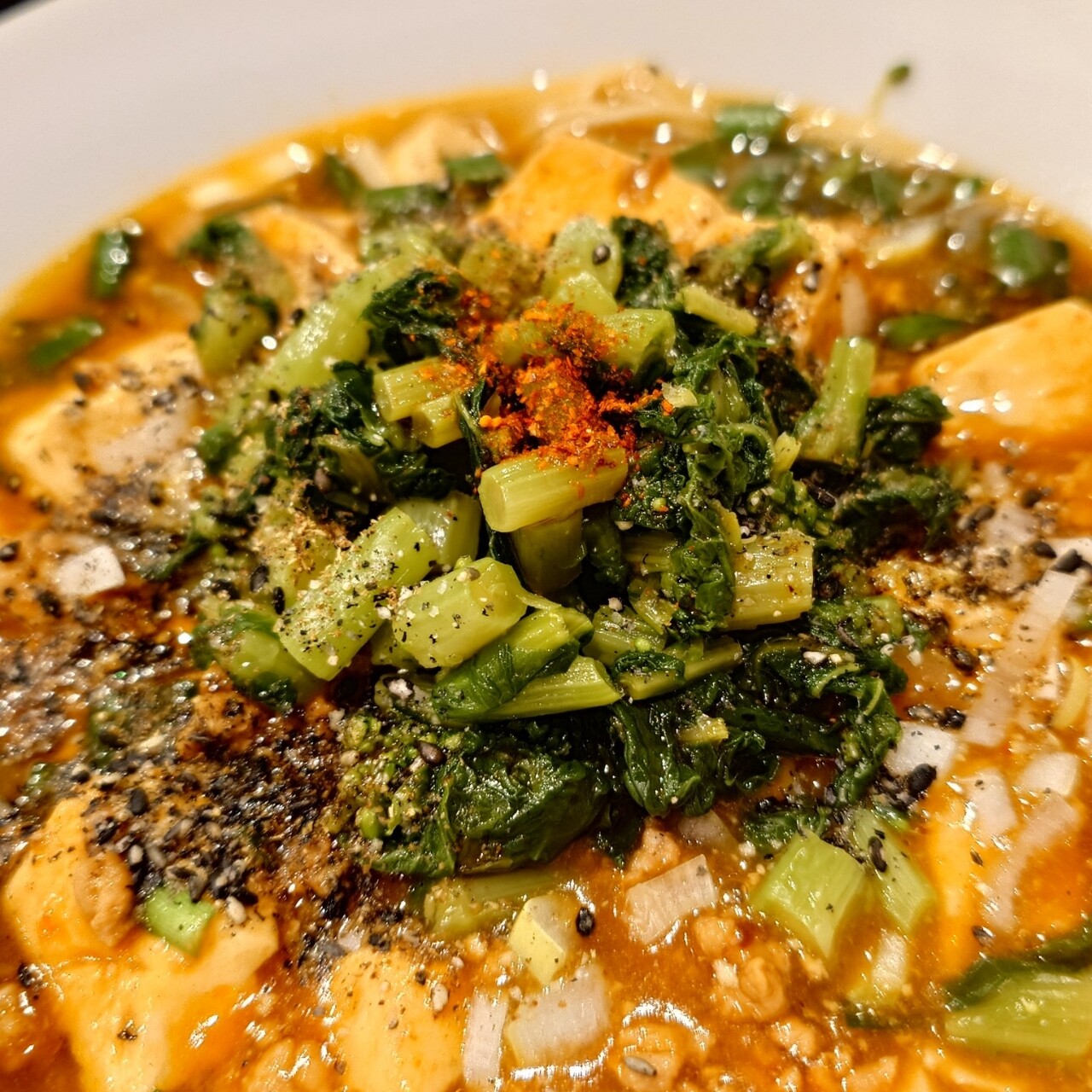 タップリと盛られた麻婆豆腐の上には、菜の花の辛し和えがタップリ盛られ、細かめに刻まれたニラや白ネギ、タマネギなどが散りばめられ、黒胡麻と唐辛子が振りかけられていました。