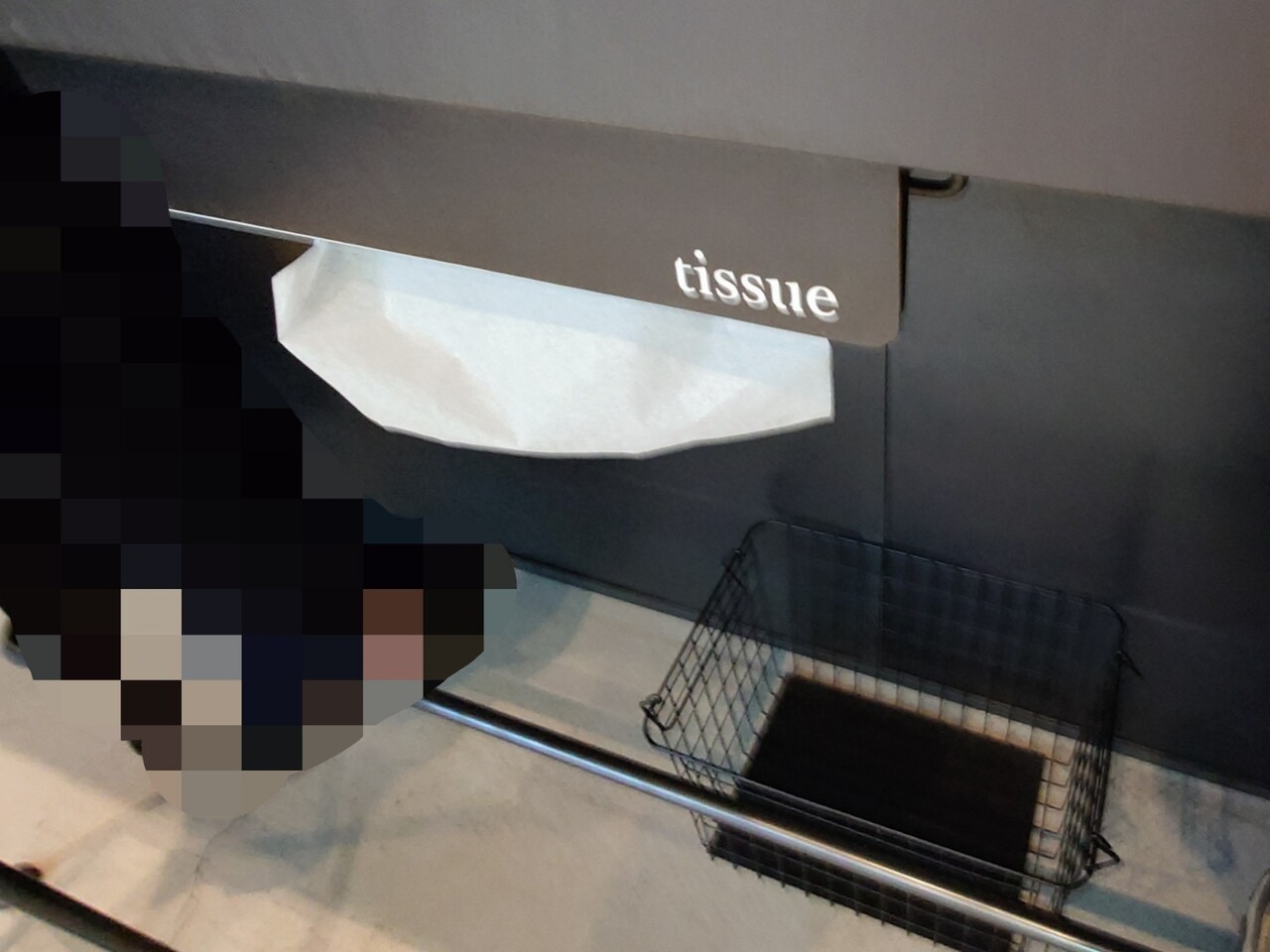 カウンターの下には、ティッシュペーパーや荷物置きのカゴが配置されています。