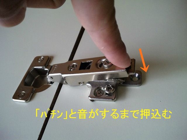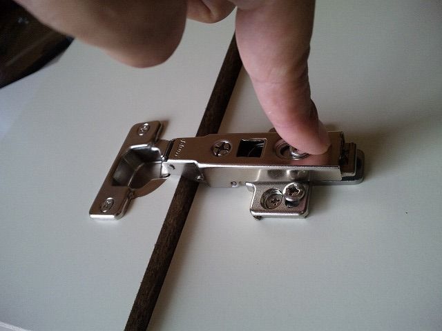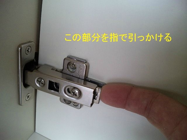 家具「本体」の丁番で、金物のうしろ部分を指で引っ掛けます