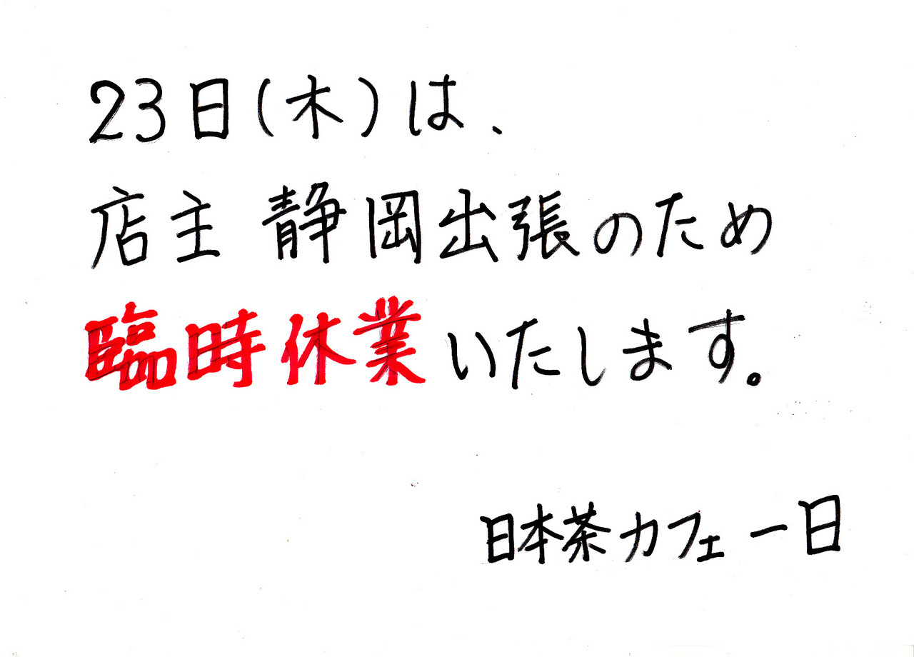 静岡への出張のため終日営業を休みます。