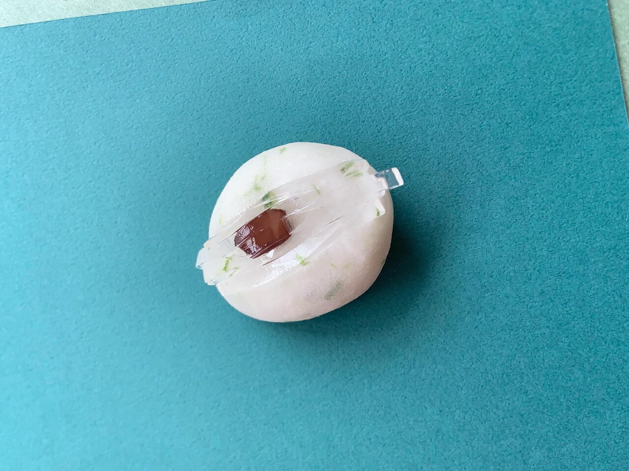 夏の味覚、鮎がおよぐ清らかな川を求肥でおつくりしました。青葉が映る川面を青のりで映し、中は手亡豆の白こし餡です。