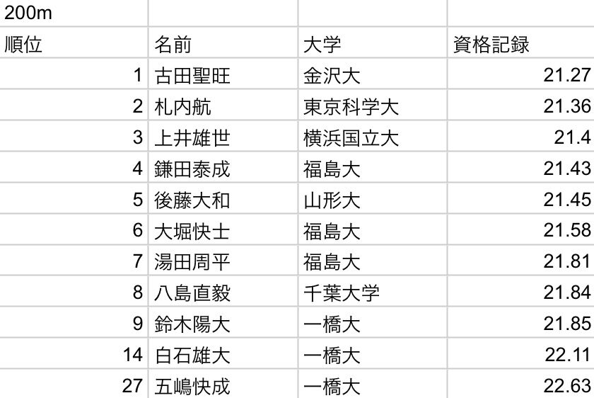 予選通過記録は200も全員可能かと思われます。快成は資格記録こそ通過記録を下回っていますが、練習水準を見ればPBの更新は可能かと思いますので、頑張ってもらいたいところです。