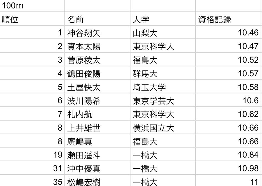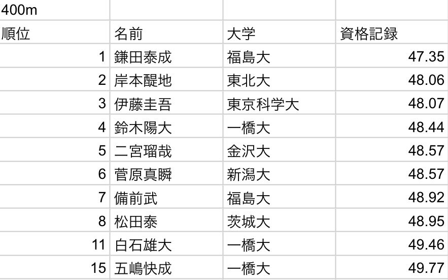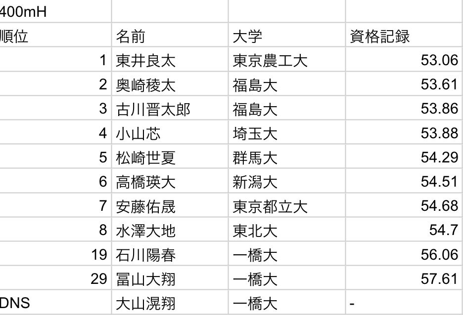 予選通過記録は上級生2人にとっての目標になるかと思います。特に妹尾さんに関しては、ちょうど通過ライン上にいるかと思いますので、ここからどう持って来れるかが非常に重要になってきます。澁谷はPBを更新しての表彰台が目標になるのではないでしょうか。富山はまずはPB更新をしたいところです。