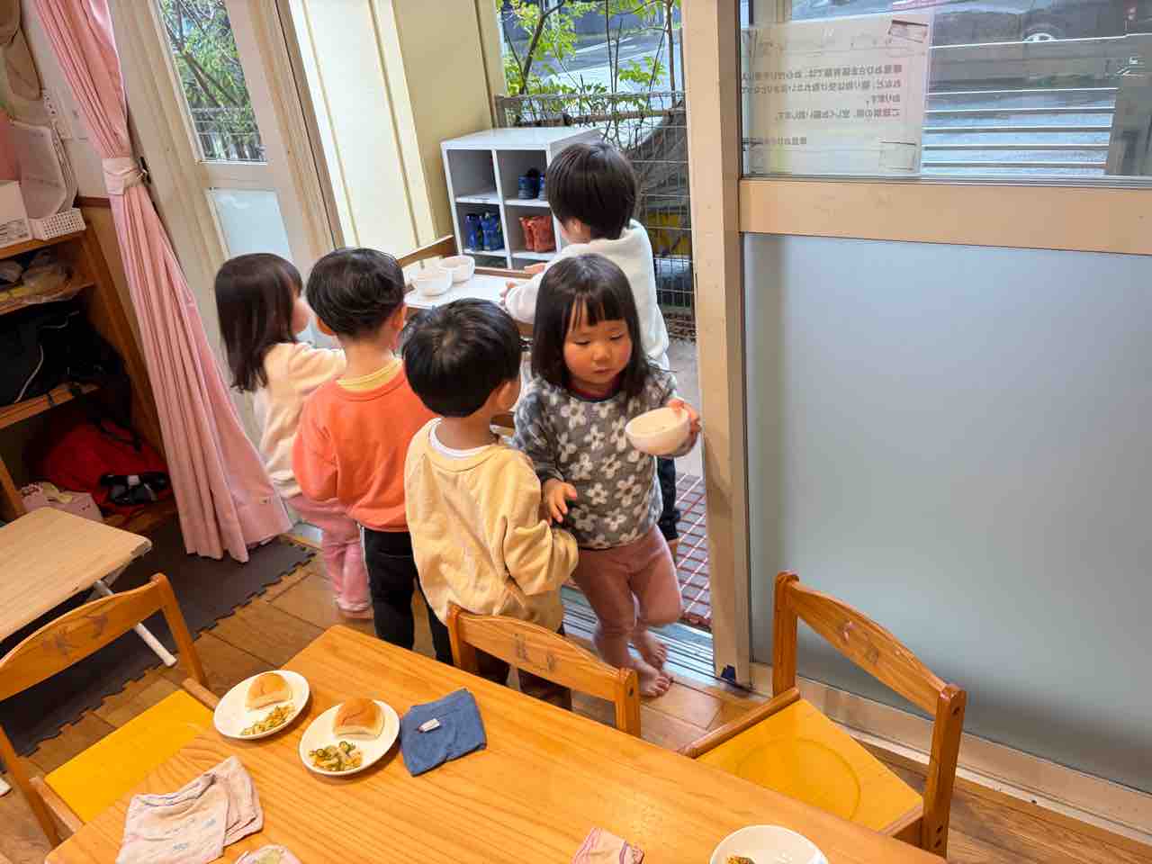 好き嫌いなくたくさん食べるぞ~とお話をして自分で給食を運んでいくよ!