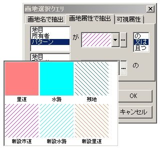 画地の塗りつぶしパターンをペイントのパターン登録と一元化しました。この最大の理由は、画地選択クエリーでのパターンを条件にした選択を簡単にしたいというものでした。