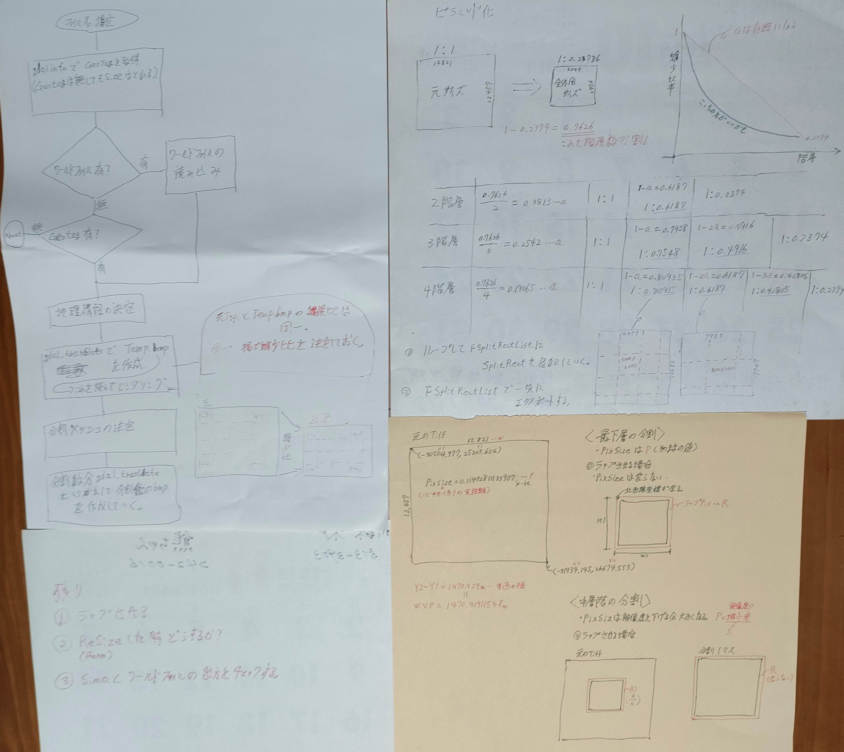 終盤、ピラミッド化するために解像度を落として切り取るのに、解像度の縮小率は実数なのに対して、画像のピクセル値(画像上での座標)は整数値なので、演算誤差が出ている事に気付き、全体的に座標丸めのタイミングを見直した。