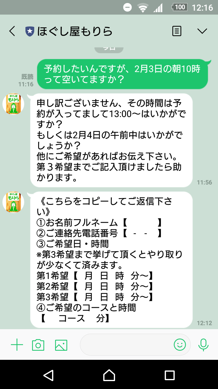 「○日にフット30分とボディ30分の組み合わせ60分を受けたいんですが、午後からだと何時なら空いてますか」など