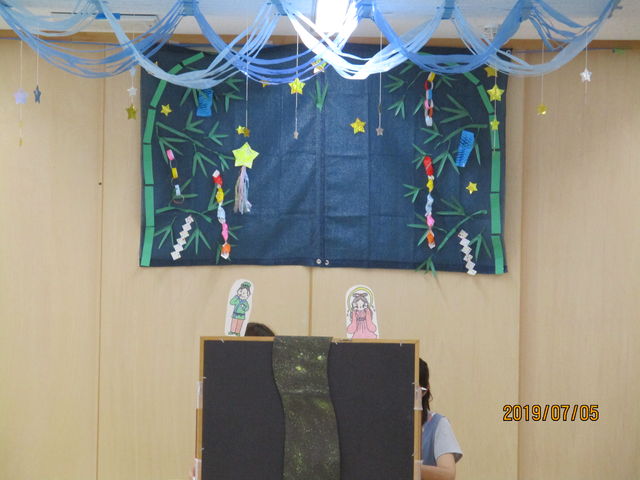 子ども達の作った七夕制作を紹介したり、七夕のお話を聞き、「たなばたさま」の歌をみんなで歌いました