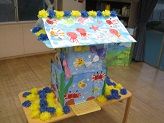 朝からあいにくの空模様でしたが、ホールでみんな元気に盆踊りを踊ることができました。お互いのスカイ・スペース組のお友だちが作ったやぐらです。テーマは ”うみ”