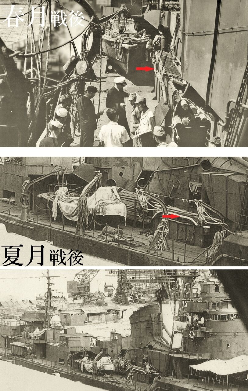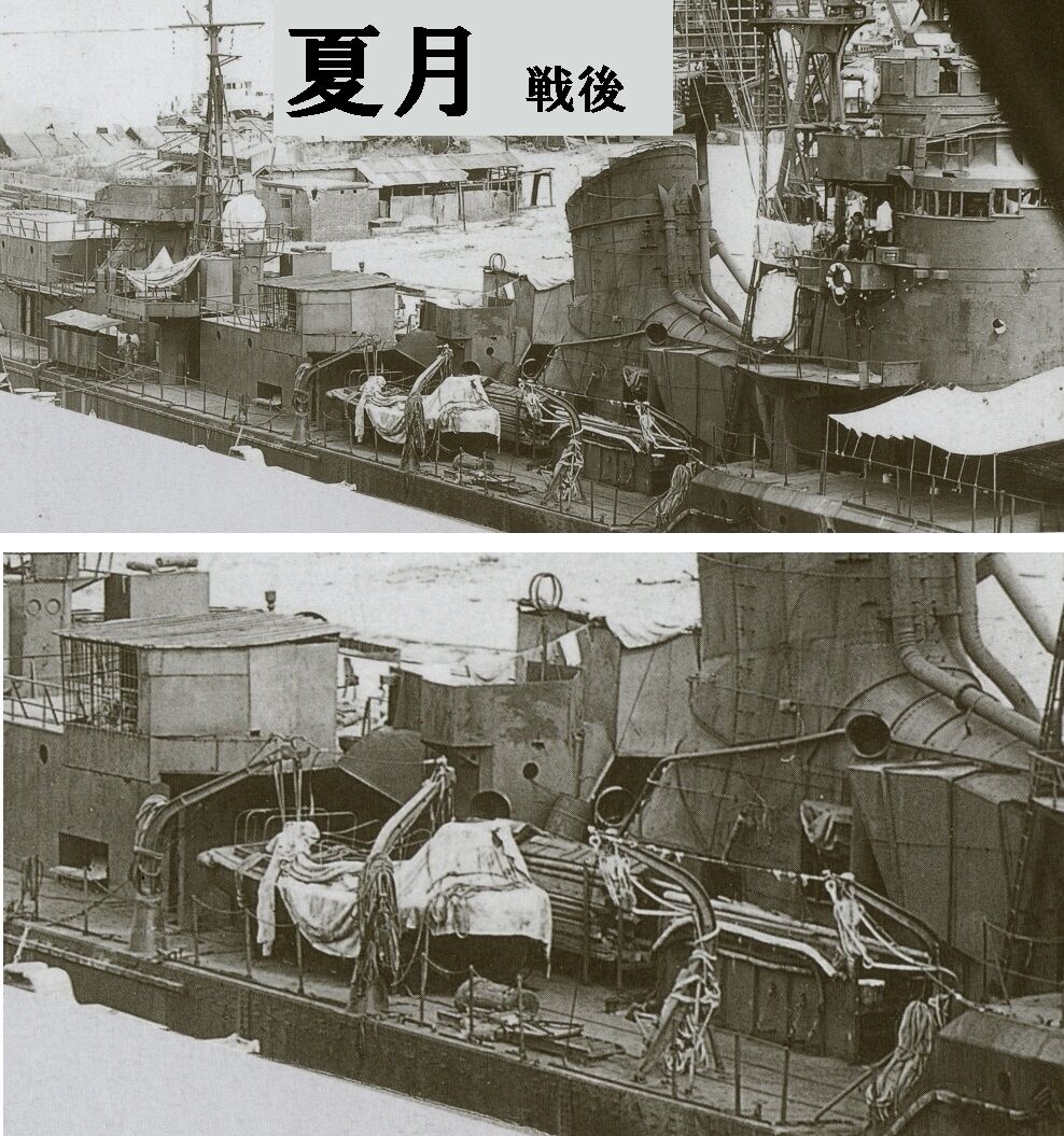 予定では本日「内火艇」作成でしたが、急遽「応急木材置場(仮称)」作成に変更しました、理由は秋月型後期艦の実写真に「応急木材」が写っているのを見つけたからです!それは下↓の「春月」「夏月」の戦後写真に写っています!↑2艦の内火艇奥に➔「応急木材置場」が確認できます、戦後なので戦闘被害を受ける訳が無く(受けても波浪被害)、この「応急木材置場」は戦中からのものと思っていいでしょう、坊ノ岬沖海戦の「冬月」も同装備をしていたと確信するところです。↑