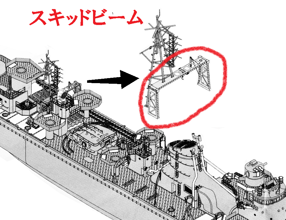 ↓しつこいですが 戦後の「春月」写真だと ?が別角度で見れますヨ。↓↑?がスキッドビーム柱に寄り添ってるのが解ります、秋月型後期艦(冬月型)はこんな感じみたいです、コレ 何の装置かご存知の方!ぜひ教えてくださいませ。↑