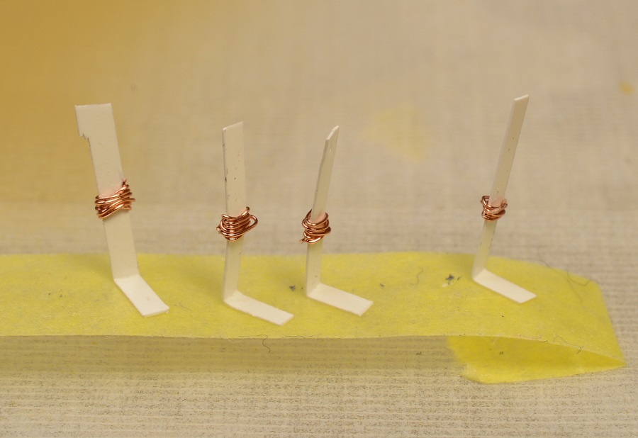 ↓束ねたロープをダビッドにぶら下げます、0.1mm銅線を薄いプラバンに巻いてロープ色に塗装しました。↓