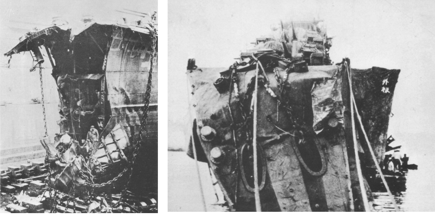 ←戦いが終わり「呉」集合を命ぜられた「冬月」は8月20日、門司港の埠頭を離れた直後に艦尾を触雷で失い航行不能となる、以降 同港にて工作設備を搭載した「工作艦」となり機雷掃海部隊のメンテナンスを担った。