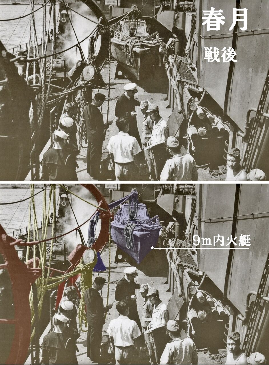 ↓戦後の「春月」写真が詳細です、カッター本体はありませんが9m内火艇とダビッドそしてロープまで情報がいっぱいです。↓