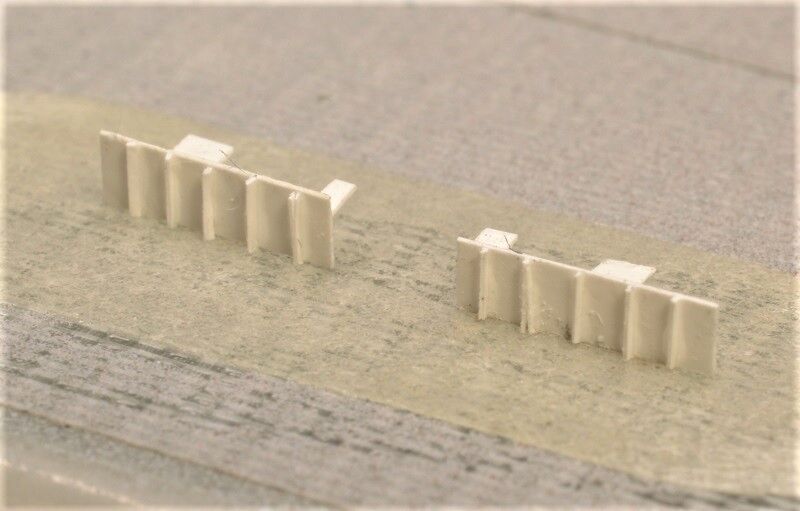 ↓煙突横の「応急木材置場」をプラペーパーで自作し軍艦色塗装します。↓↓↑軍艦色塗装したら煙突側壁横に接着します、蒸気捨管とモンキーラッタルを上手くかわしてるのがわかりますでしょうか?↓↑