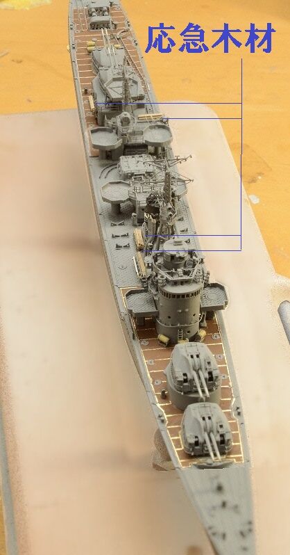 ↓第3主砲塔の右舷側完成です ジャンクエッチングとプラ角材で自作しました。↓↑「スキッドビーム上」の「応急木材置場」も自作完成です、さらに?を伸ばしランナーで自作しました。↑