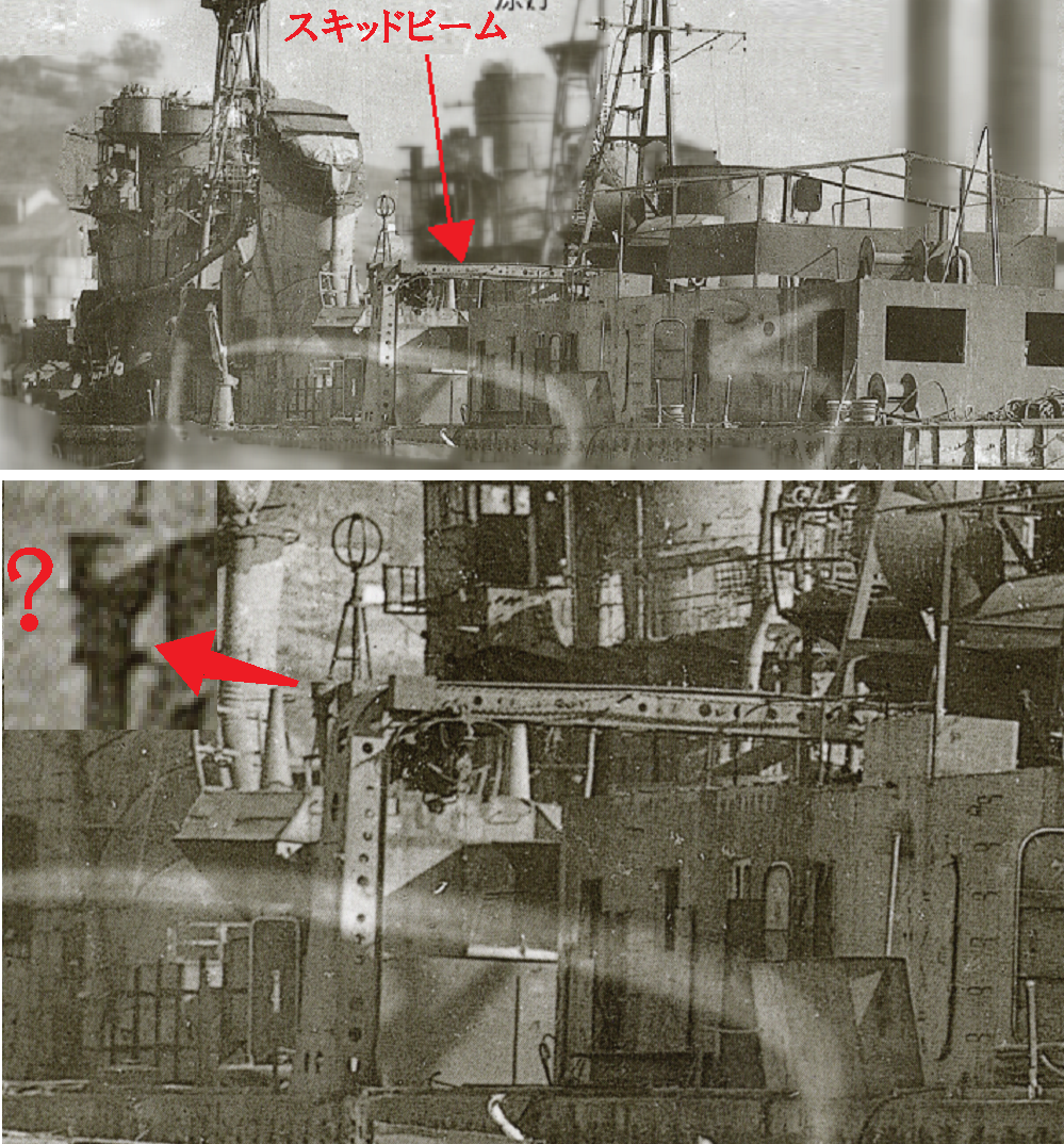 ↓「スキッドビーム上」の「応急木材置場」は工作艦任務終了後の「冬月」写真に その根拠が写ってます、それでは 先程の?を思い出してください。↓↑↓「冬月」のスキッドビームをズーム拡大していくと 先程の?が見えてきます。↑↓↑?傍にスキッドビームあるのは明白、「夏月」写真で見えた「応急木材置場」はスキッドビーム上で間違いないです。↑