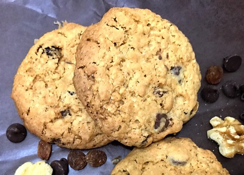 オートミール、チョコチップ、くるみ、レーズンがたっぷり入ったザクザク食感のクッキー