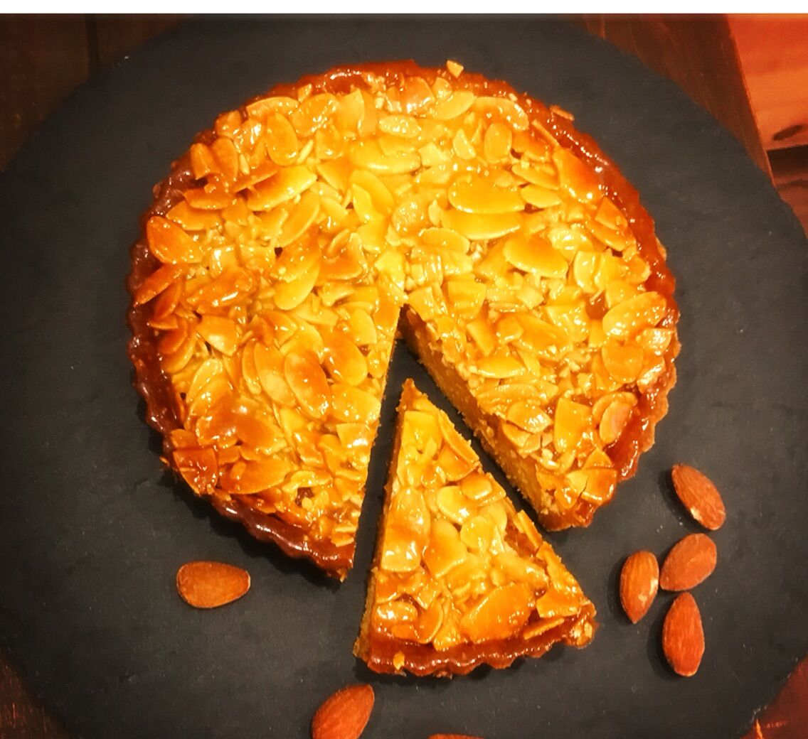 タルト台にアーモンドクリームをたっぷり敷き詰め、更にキャラメリーゼしたスライスアーモンドをトッピングして焼き上げたアーモンドたっぷりのタルトです