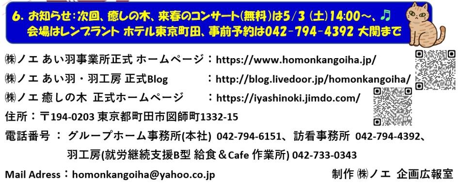 ⑥ お知らせ:次回、癒しの羽コンサート(無料)は