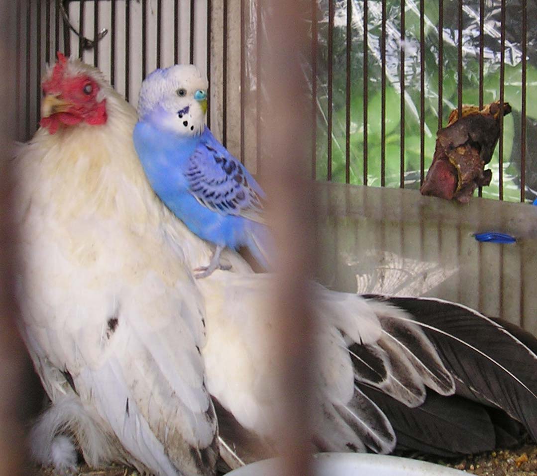 用事を済ませ、帰りにまた覗いてみたらやっぱりニワトリにインコ乗ってました。
