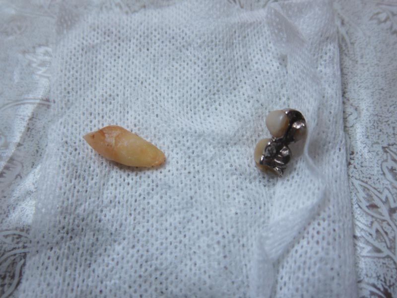 下の写真の左が5番、犬歯です。歯はきれいです。歯石をとった後なので、歯石はなし。右が、ブリッジを切断して抜いた3番です。ダミーの2番も見えています。