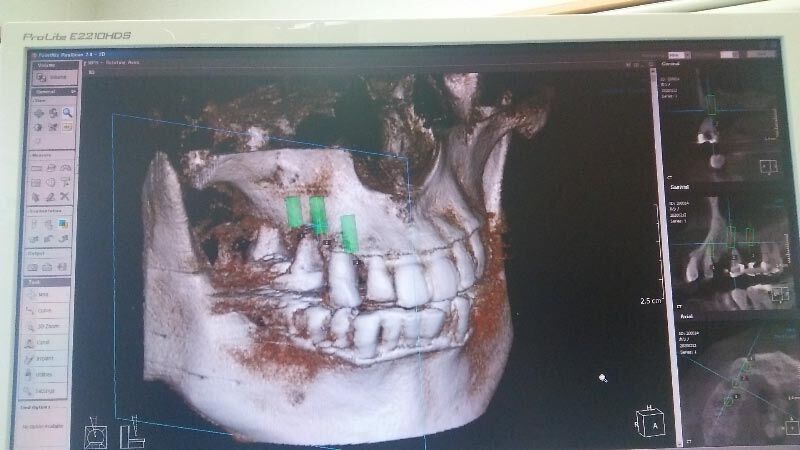 先生は、これを観て、歯石をとった後の最終処置として、根が浮いている3番とすでに抜けた4番の隣の5番を抜いて、3本の人工歯根を立て、その歯根に4本の歯を装着するといという計画を提案しました。人工歯根の位置は、下の写真の緑色の位置です。