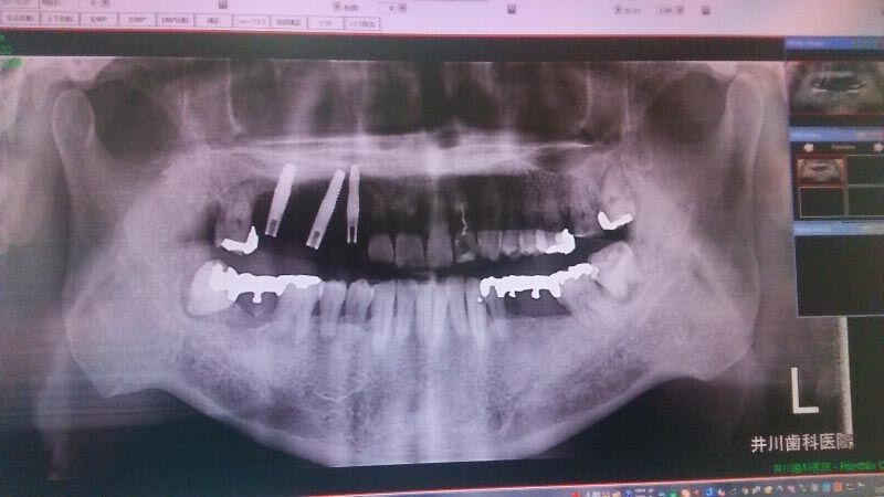 上記の抜歯に続いて、同日に、インプラントの手術をしました、下の写真は術後に撮ったレントゲンです。左の方に写っているマッチ棒のような細い3本が人工歯根です。直径は4mmです。