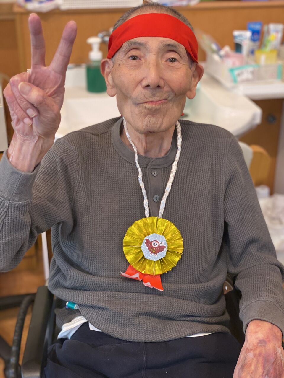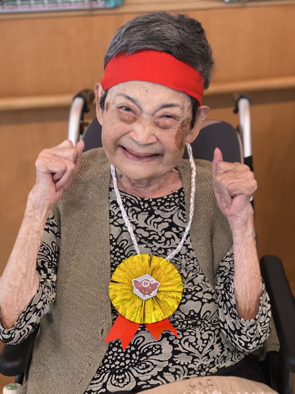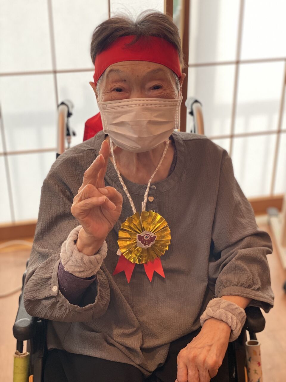 2025年11月07日 運動会 11月に入り、残りも2ヶ月となりました。先日神の倉では、秋のレクリエーションで運動会を開催しました。いつもの練習しているハンドベルから開幕。赤白の鉢巻きをまいて、大玉転がしや玉入れも。後半にはお相撲さんや恐竜🦖に扮したスタッフも登場して盛り上がっていました。最後はメダルをもらって皆さんいい笑顔ですね