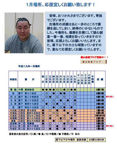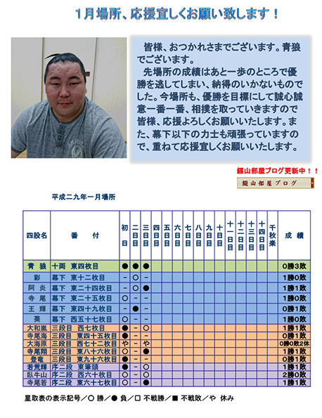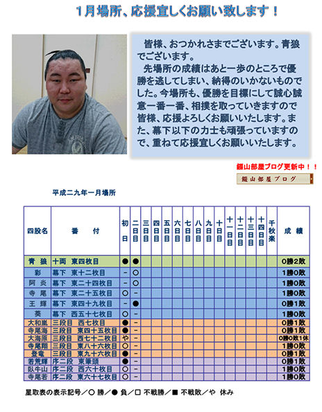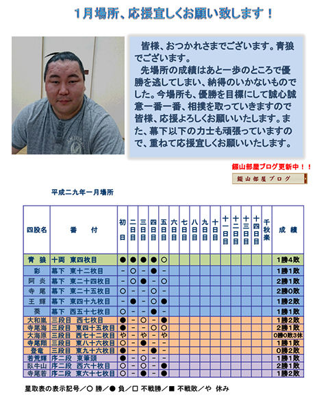 先場所の成績はあと一歩のところで優勝を逃してしまい、納得のいかないものでした。今場所も、優勝を目標にして誠心誠意一番一番、相撲を取っていきますので皆様、応援よろしくお願いいたします。また、幕下以下の力士も頑張っていますので、重ねて応援宜しくお願いいたします。