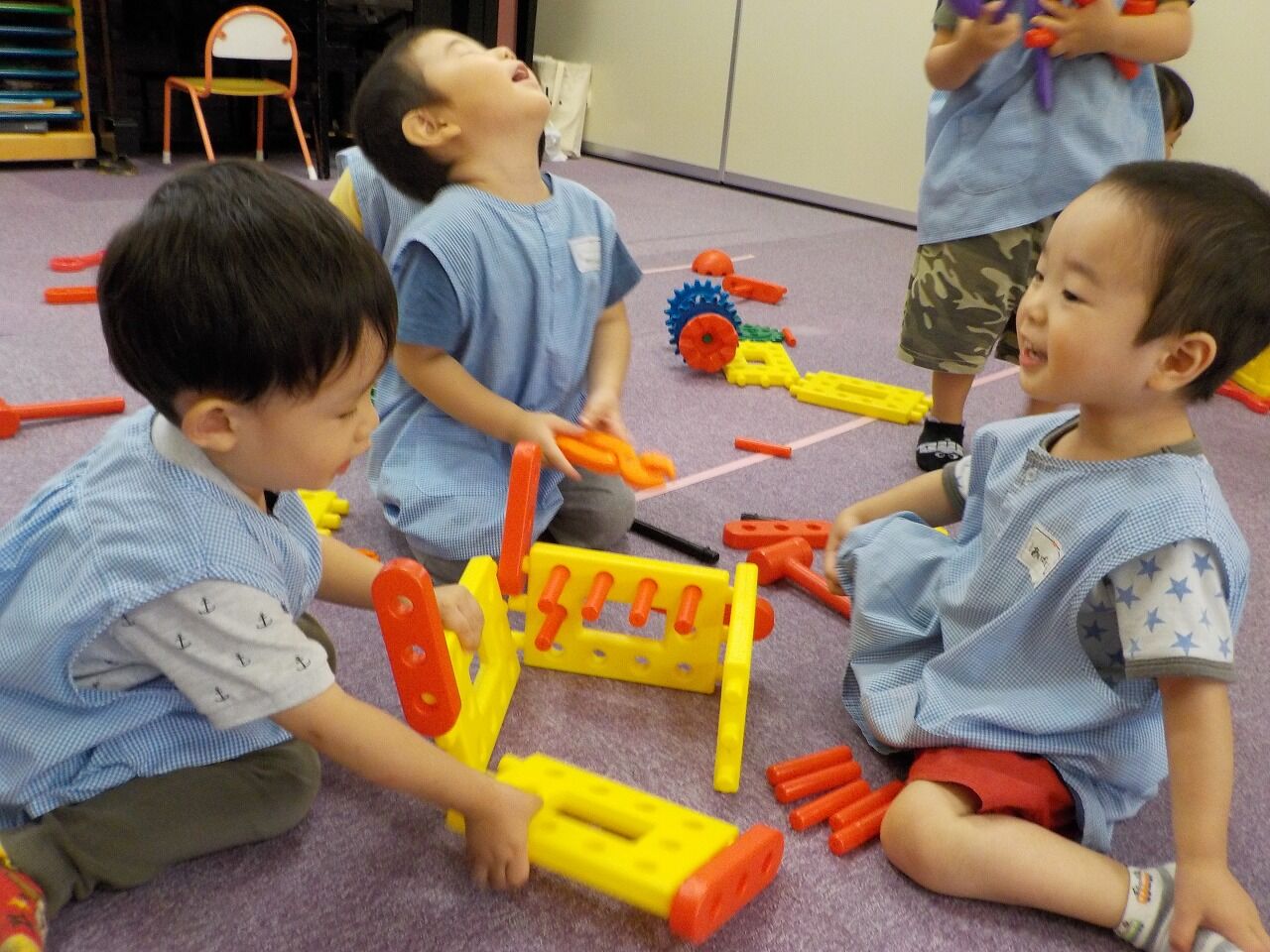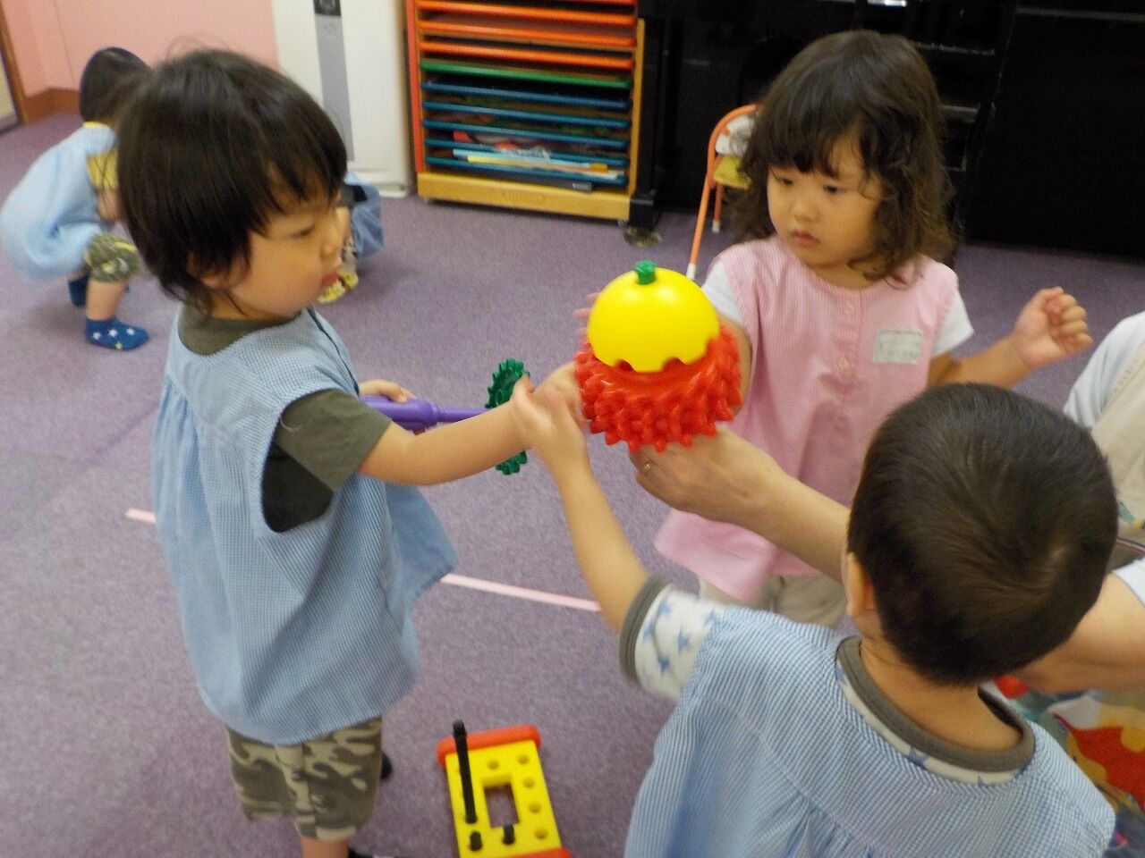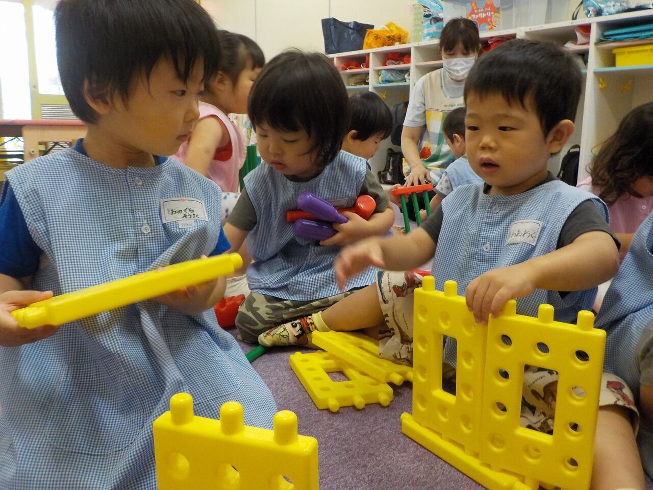 「かーしーて」や「どーぞ」と譲り合ったり、「おうちつくろうか」と