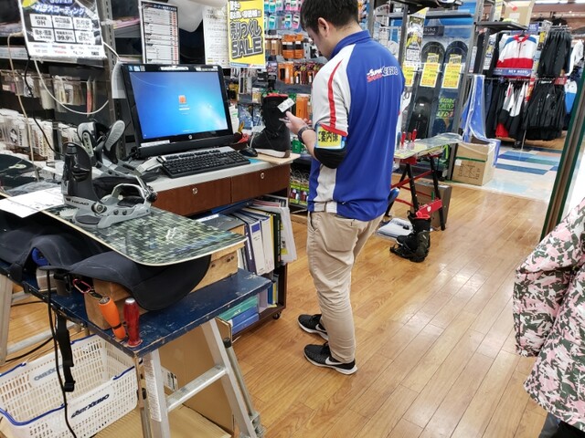 (左に映ってるのが使ってる板)その日は相場感見ながら「靴も痛いし、一緒に取り替えると五万コース…板セットにしちゃった方が、実はプラ一万とかで安く行けんじゃね?元々のは元取ってるとは思うけども、どうしたもんかなぁ」と、まあまあ頭抱えながら帰ったんですけどね。