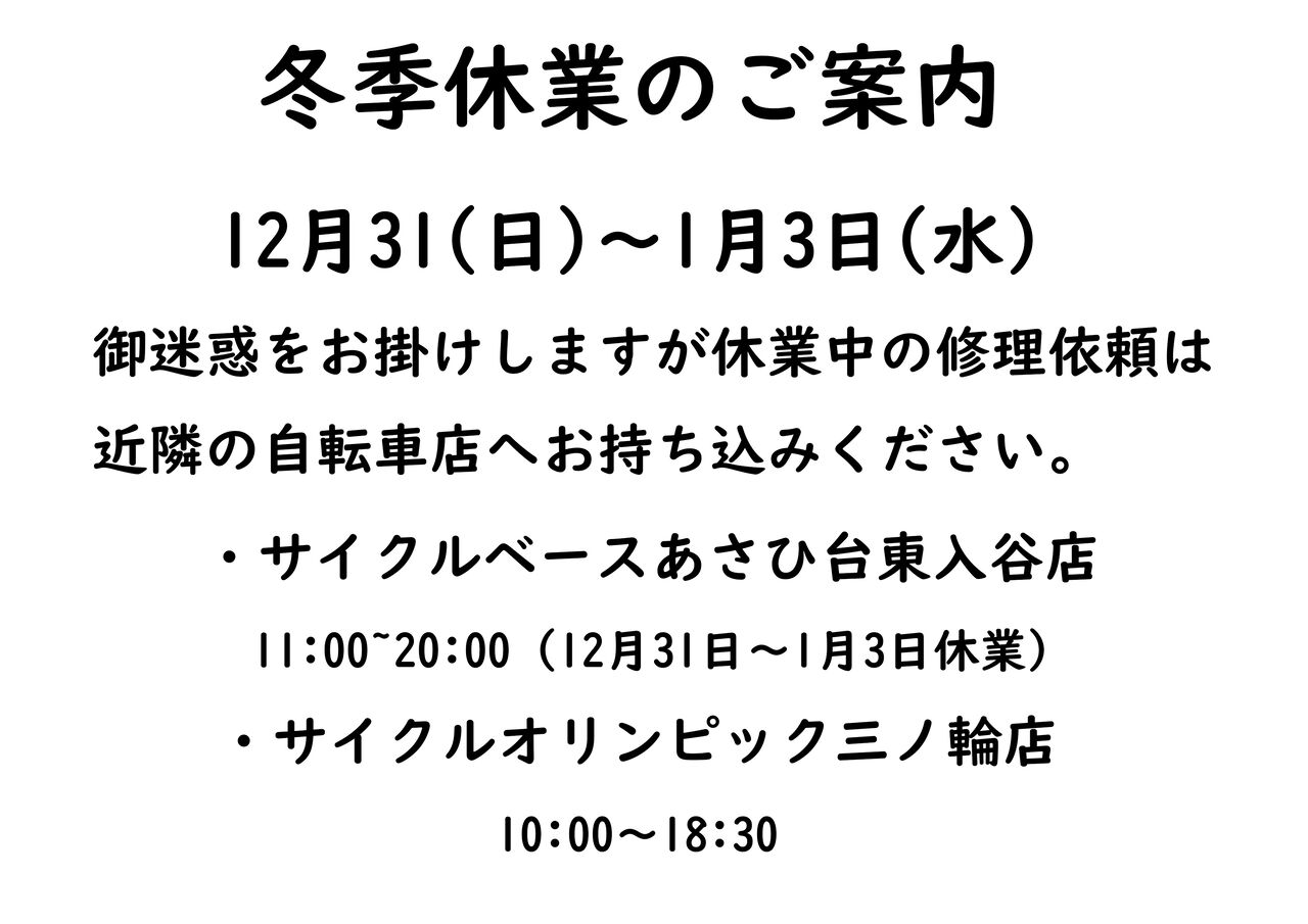 2023年12月30日| 冬季休業のご案内 2023年も大変お世話になりました。明日から少しお休みさせていただきます。誠に申し訳ございませんが休業中の修理は近隣自転車店へお持ち込みください。 来年も何卒宜しくお願いいたします。 mixiチェック カテゴリなしの他の記事