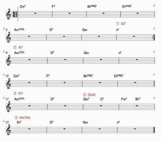 ¤³¤Á¤é¤Ï»ÍÅٿʹԤ·¤Æ¤¤¤Æ²ò·èÀ褬¥Þ¥¤¥Ê¡¼¥³¡¼¥É¤Î¥±¡¼¥¹¤Ç¤¹¡£¤Þ¤¢¡¢¥Æ¥ó¥·¥ç¥ó¤â½ñ¤«¤ì¤Á¤ã¤Ã¤Æ¤Þ¤¹¤±¤É¤Í¡Ê¾Ð¡Ë¡£»ØÄꤵ¤ì¤Æ¤¤¤ë¤Î¤Çb9th·Ï¤òÁª¤Ö¤Ù¤¤Ç¤·¤ç¤¦¡£¤½¤ÎÁ°¤Î¥³¡¼¥ÉDm7b5¤âÂç»ö¤Ê¼ê¤¬¤«¤ê¤Ë¤Ê¤ê¤Þ¤¹¡£m7b5¤Î¥³¡¼¥É¤¬Íè¤Æ¡¢»ÍÅٿʹԤ·¤Æ¤¤¤ì¤Ð¼¡¤Ï¤Û¤Ü´Ö°ã¤¤¤Ê¤¯b9th·Ï¤Î¥Æ¥ó¥·¥ç¥ó¤Ë¤Ê¤ê¤Þ¤¹¡£